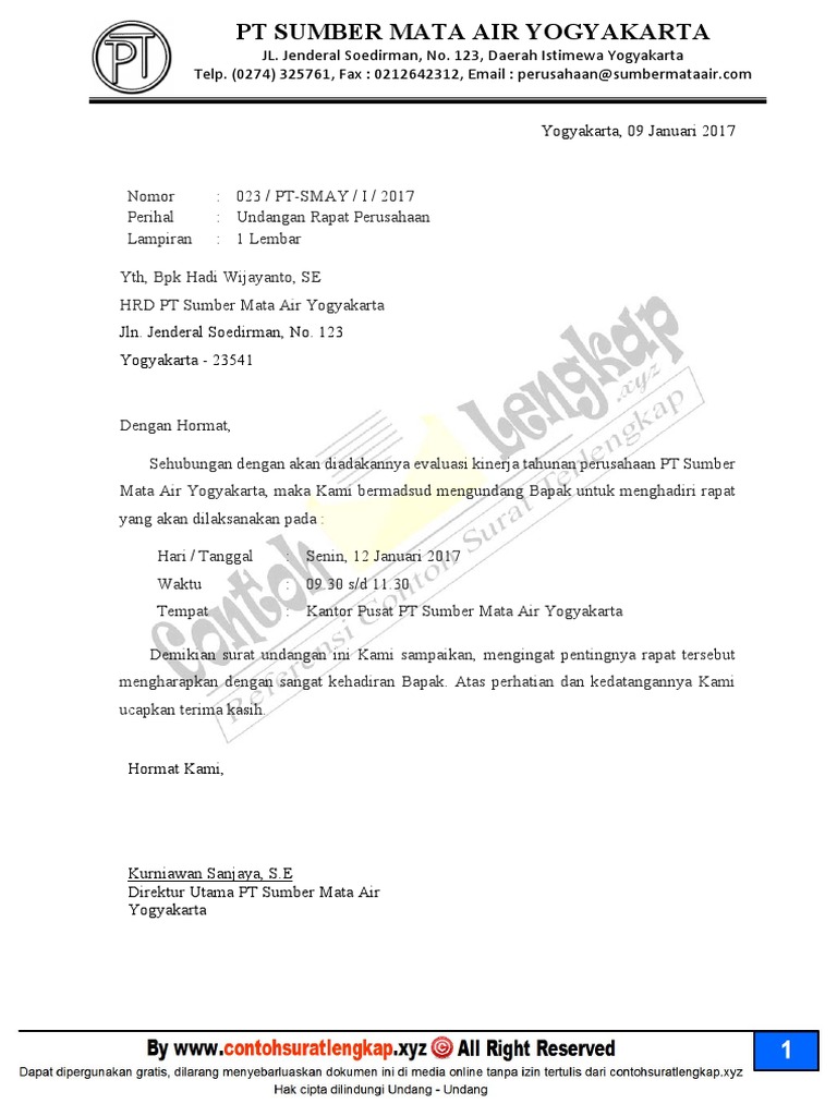 Sebuah perusahaan tentu akan sangat ketat dalam menjalankan administrasi. Rapat dinas merupakan rapat resmi yang diadakan oleh instansi pemerintahan untuk melakukan koordinasi rutin di antara. Surat undangan resmi ini termasuk kedalam surat resmi. Contoh surat undangan lengkap dengan segala keterangannya. Surat resmi terdiri dari kop surat, nomor, lampiran, perihal, serta adanya tanda tangan dan stempel khusus dari lembaga yang bersangkutan.